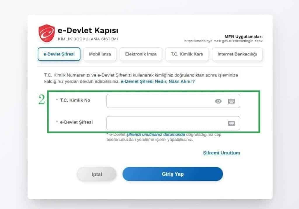 2. E-devlet sisteminde; öğrencinin E-okulda velisi olarak tanımlı kişinin e-devlet şifresi ile giriş yapılır.